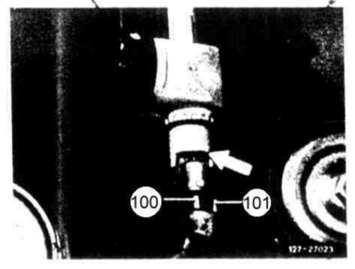 163 Engage control pressure cable with vacuum element on connecting rod (100). Introduce limiting rod (101) into bore (arrow) and insert control pressure cable.
