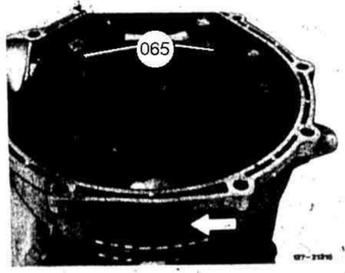 Grease drive flange (32) with Molykote. Move torque converter back and forth during installation for easy meshing of teeth. Insert plastic holding pin (arrow) and turn clockwise for 1/4 turn.