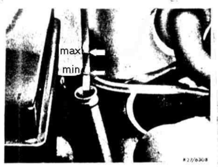 38 Fill in transmission fluid through filling-in funnel with filter 126 589 12 63 00 and perform oil level checkup (Maintenance Manual job item 2710). With transmission at operating temperature, and at correct oil level, the readout should be at max. mark.