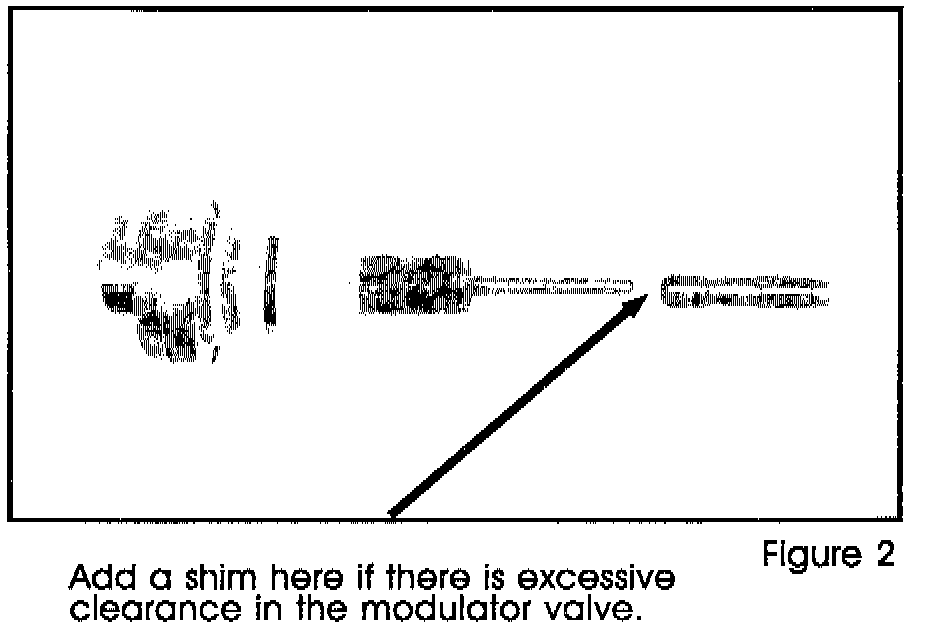 To inspect for this condition, remove the modulator. Start the engine and press in on the modulator valve assembly (figure one). If there is now pressure showing on the pressure gauge, make a shim and install it into the modulator valve (figure two).