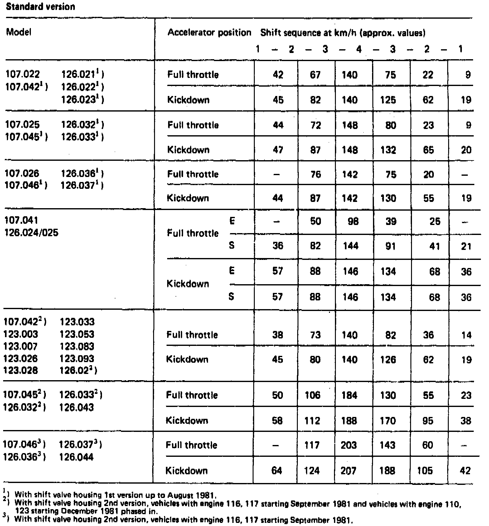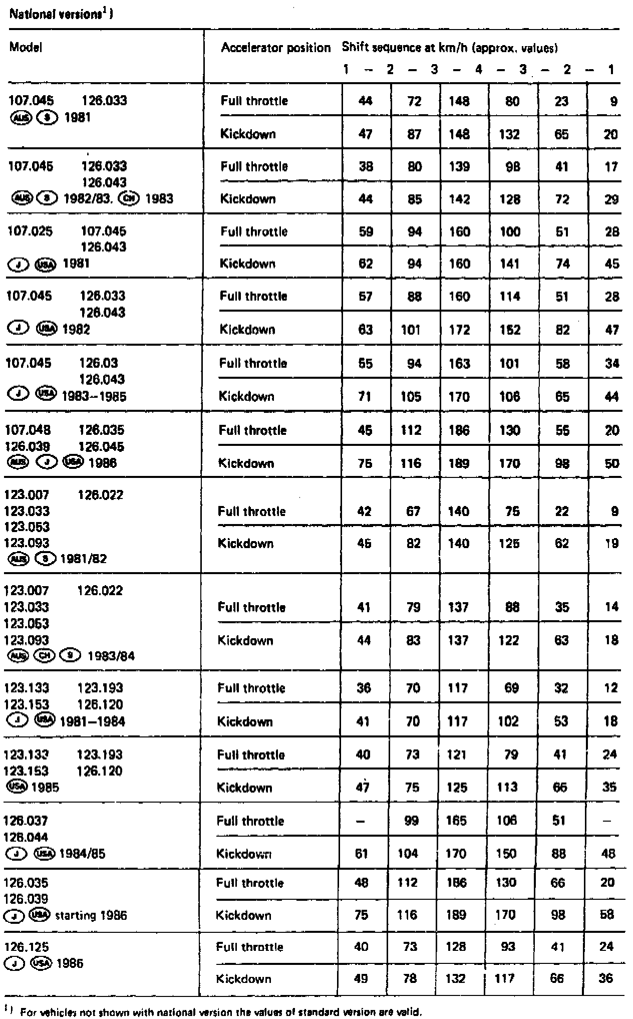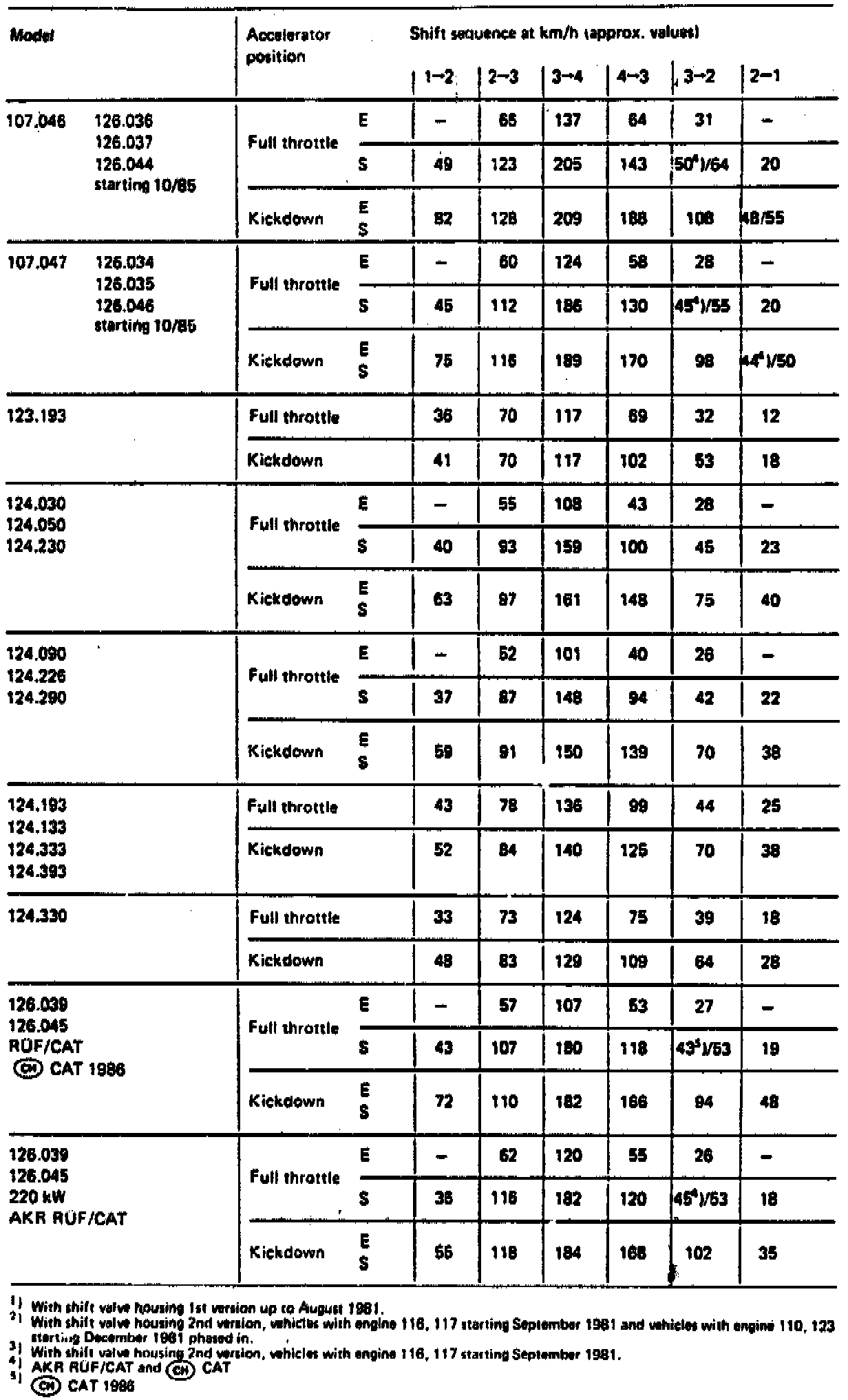 NOTE: All speed data are approximate. They apply to respectively valid rear axle ratio and tires of series vehicles. Deviations from named data are influenced by dispersions at transmission end as well as by speedometer readout.Vehicles with selector program. Switch position:
