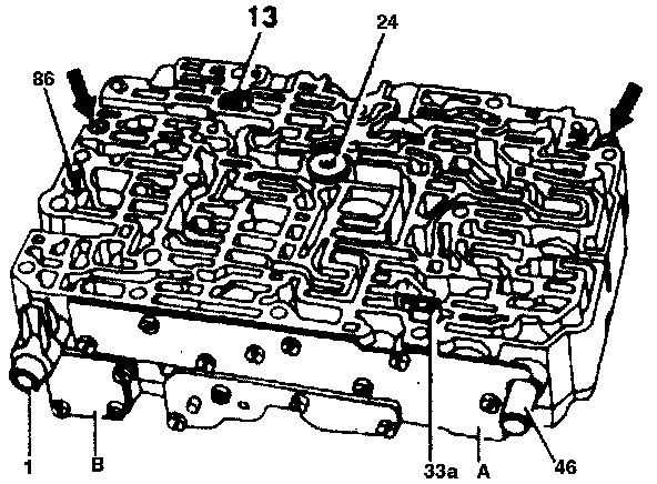 Install modified Plate-type check valve with throttle.(13), p/n 124 270 02 89, in shift valve housing of valve body.