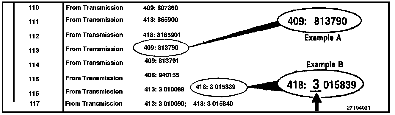 Footnotes for Example B will have the transmission series (*418*) followed by the number 3 (arrow, Figure 1) and then the last six digits of complete transmission number.