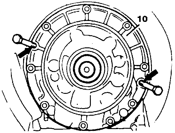 1. Screw two bolts into the threaded bores (arrows) and use these to pull out the front transmission cover (10).