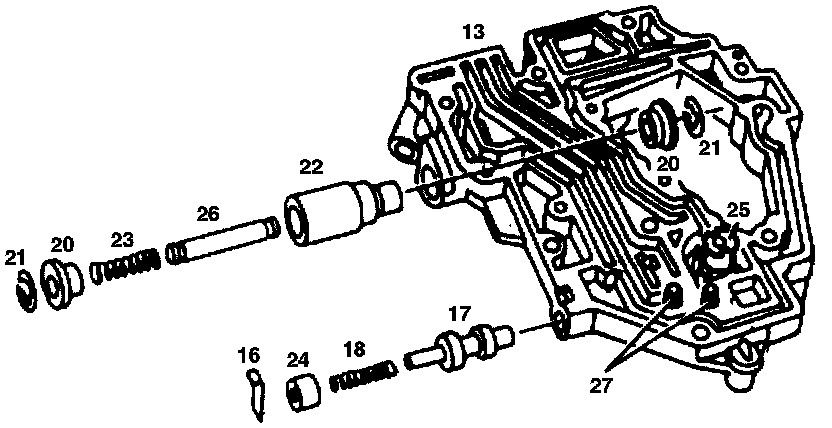 Centrifugal governor drive gear could be broken due to secondary pump gear being blocked by the spring of Check valve (67), (item 25 in illustration), located in valve body lower cover (C), (item 13 in illustration).