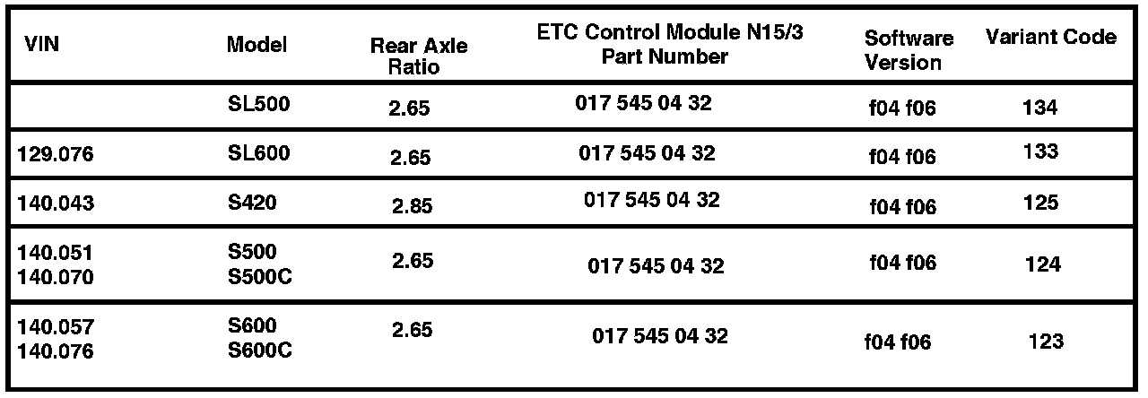 If confirming that transmission control modules N15/3 is correctly coded, please refer to the variant code chart and information listed below.