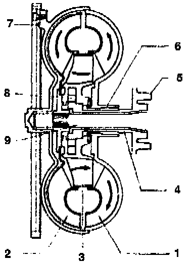 The torque converter is a self-contained unit. The turbine wheel (2) rotates freely in the cover shell (7) which is connected to the impeller (1), the reactor (3) is mounted on a freewheel unit (8) and locks in the counter-enginewise direction of rotation.