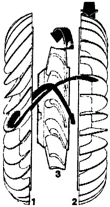 When the impeller (1) rotates, the oil is flung outward into the turbine wheel (2) as a result of the centrifugal force.