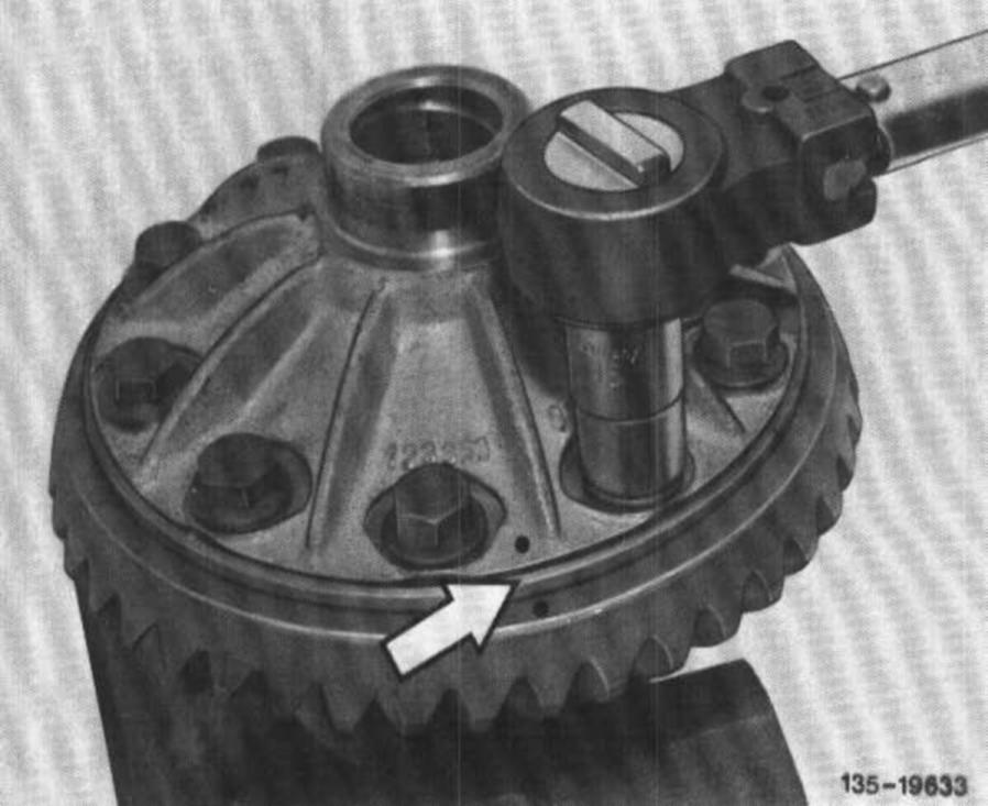 61 Carefully clean bore of ring gear and seat on differential housing. Heat ring gear to approx. 60-70°C and place on differential housing. Pay attention to identification marks of ring gear and differential housing, if recorded (arrow).