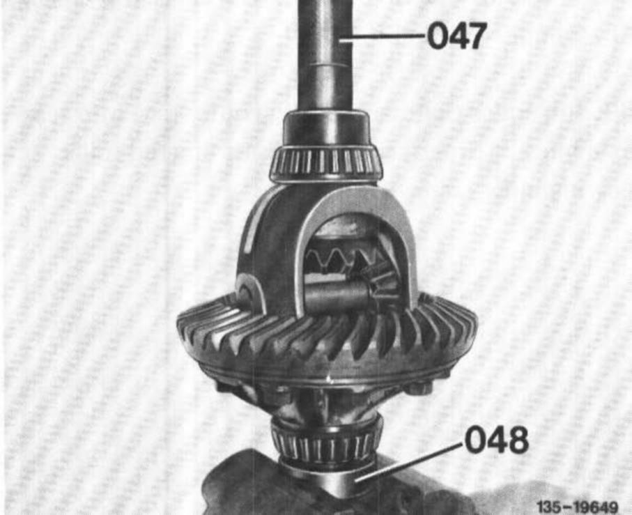 63 Press inner races of tapered roller bearings on differential housing by means of assembly mandrel (047).