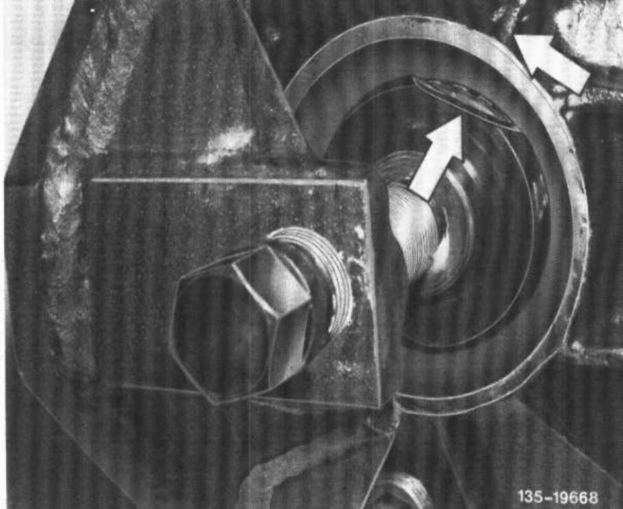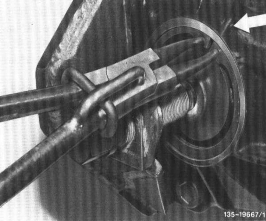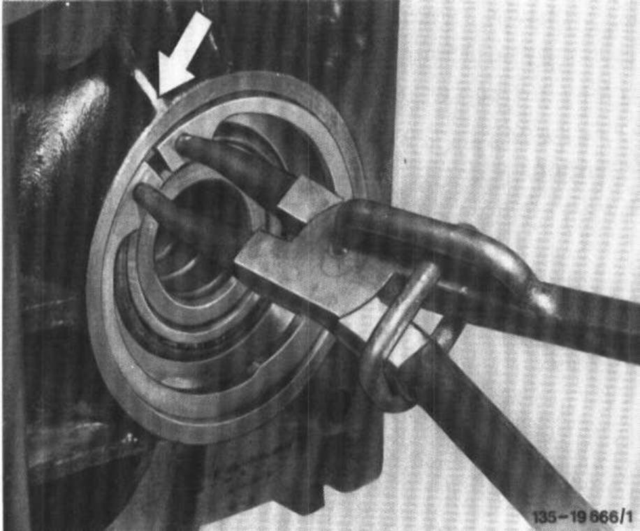67 Remove assembly mandrel at the left. Insert previously removed locking ring into slot in such a manner that the eye of the locking ring is in alignment with the web of rear axle housing (arrow).