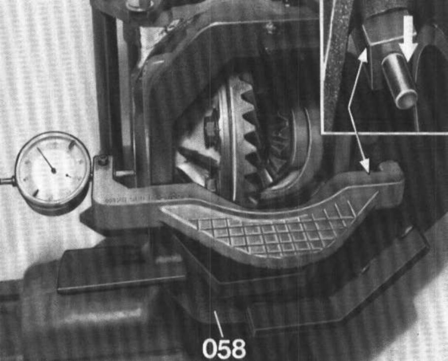 79 By moving dial gauge holder, measure backlash at 4 points along circumference of ring gear. The smallest backlash is decisive. Backlash should be between 0.08-0.14 mm. During each measurement, hold drive pinion in place at universal flange.
