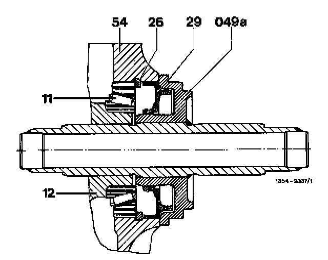 Note: Adjustment of tapered roller bearings and gear assembly is in order, if the spread dimension (widening) of rear axle housing and backlash are in range of nominal values. If these values are not attained, repeat adjustment using either thicker or thinner locking rings (26).