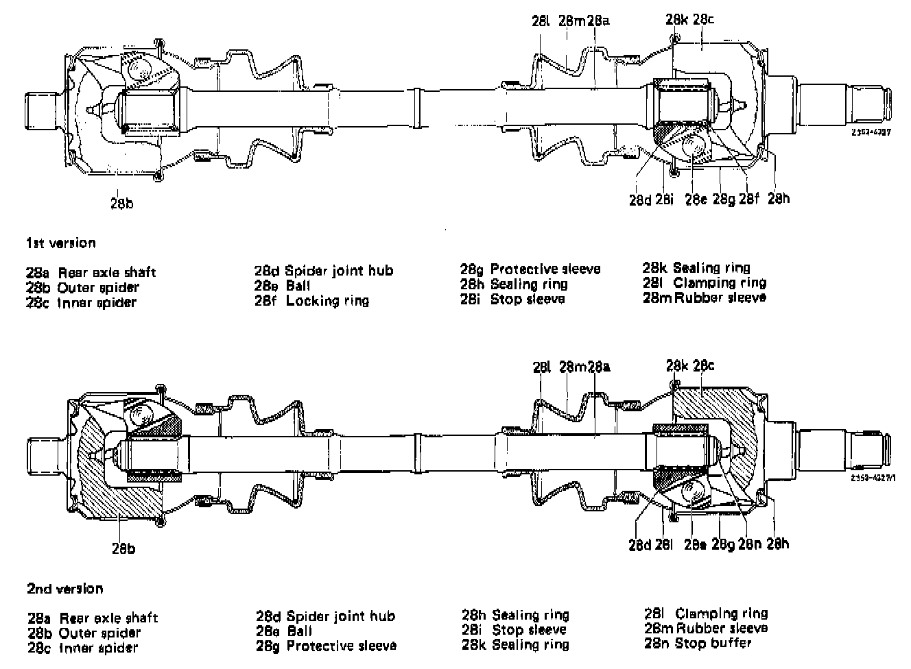- The rubber sleeve of rear axle shaft with large inner joint can be renewed only after disassembly of small joint. If the large inner joint is leaking e.g. between protective sleeve and spider or on bead between protective sleeve and stop sleeve, the complete rear axle shaft must be renewed, since no cutting and beading tool is available for the protective and stop sleeve of the large joint.