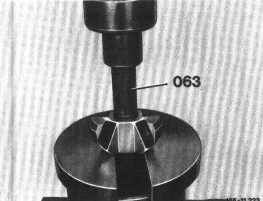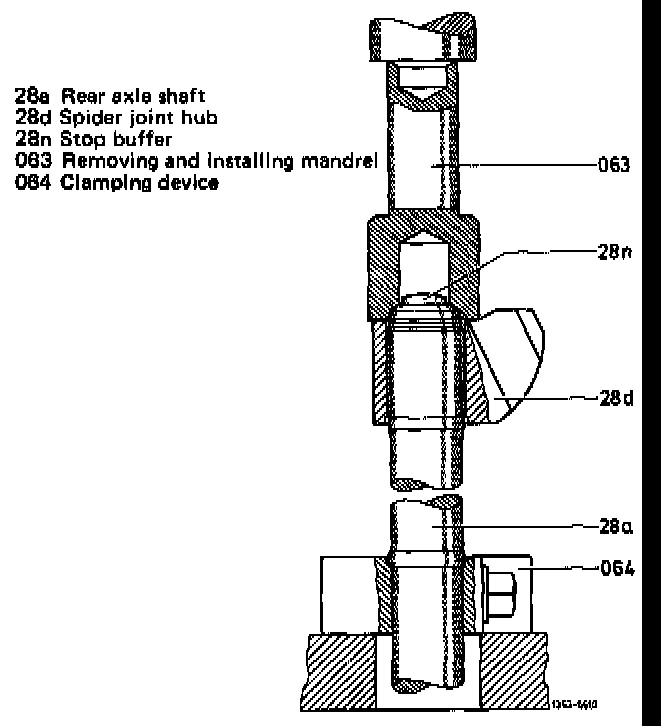 17 Press on spider joint hub (28d) of 2nd version (without stop surface) by means of installing mandrel (063) until mandrel rests against cone of rear axle shaft.