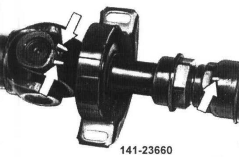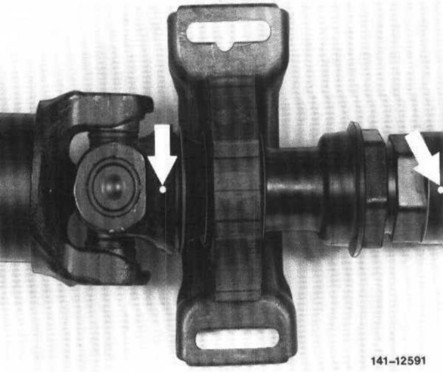 21 On vehicles starting August 1982 the identification is located on front and rear propeller shaft. The front shaft has one hump and the yoke of the rear shaft has two arrow-like humps (arrows). The hump of the front shaft should be located between the two arrows on yoke (arrows).