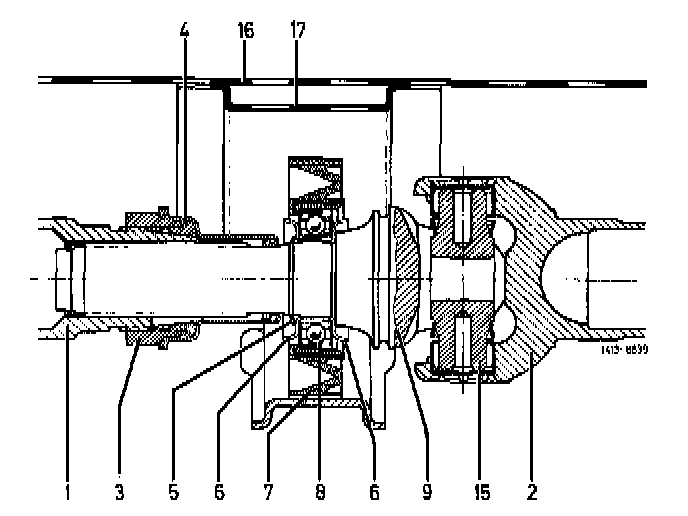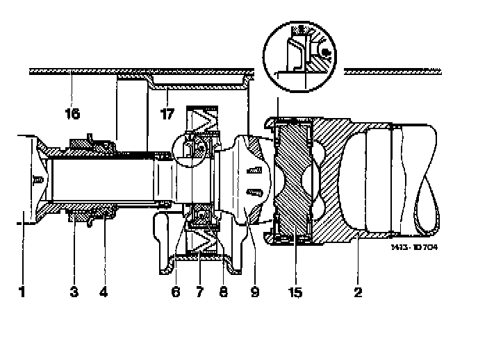 17 On vehicles starting August 1982, mount self-locking protective cap with pressing-on sleeve while making sure that the protective cap is resting well against radial ball bearing (cutout in image).