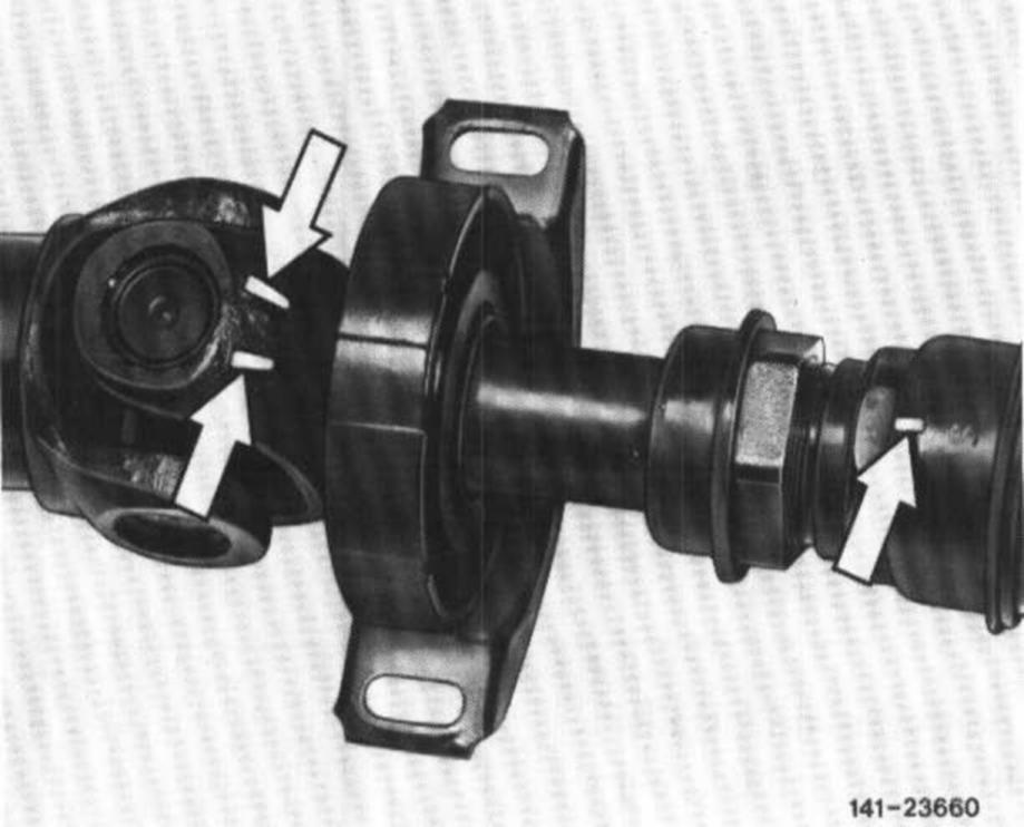 2 On vehicles starting August 1982 the front and the rear propeller shaft are marked in relation to each other (arrows).