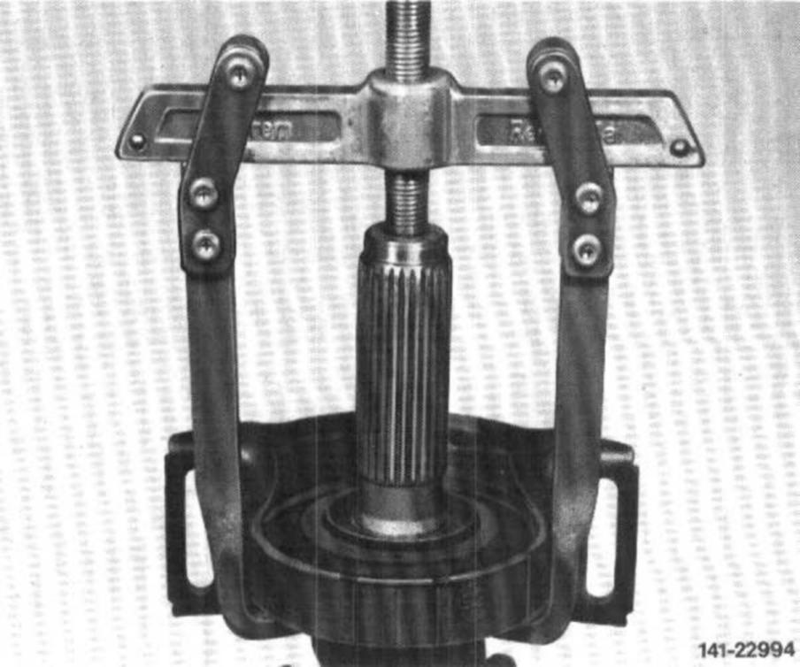 8 On vehicles starting August 1982, pull rubber mount, radial ball bearing and protective cap together from yoke by means of two-arm puller.