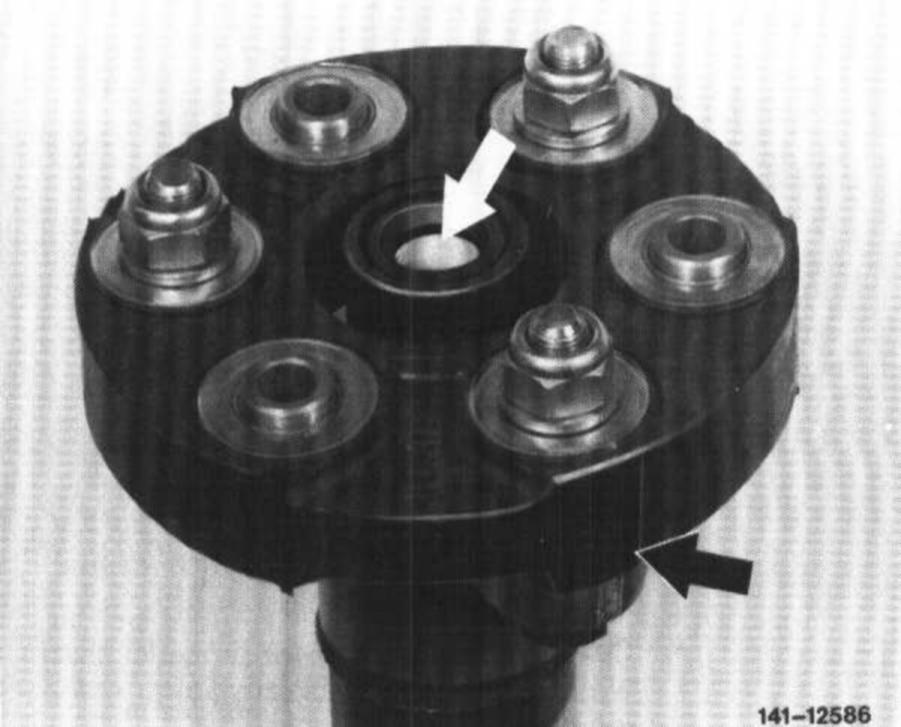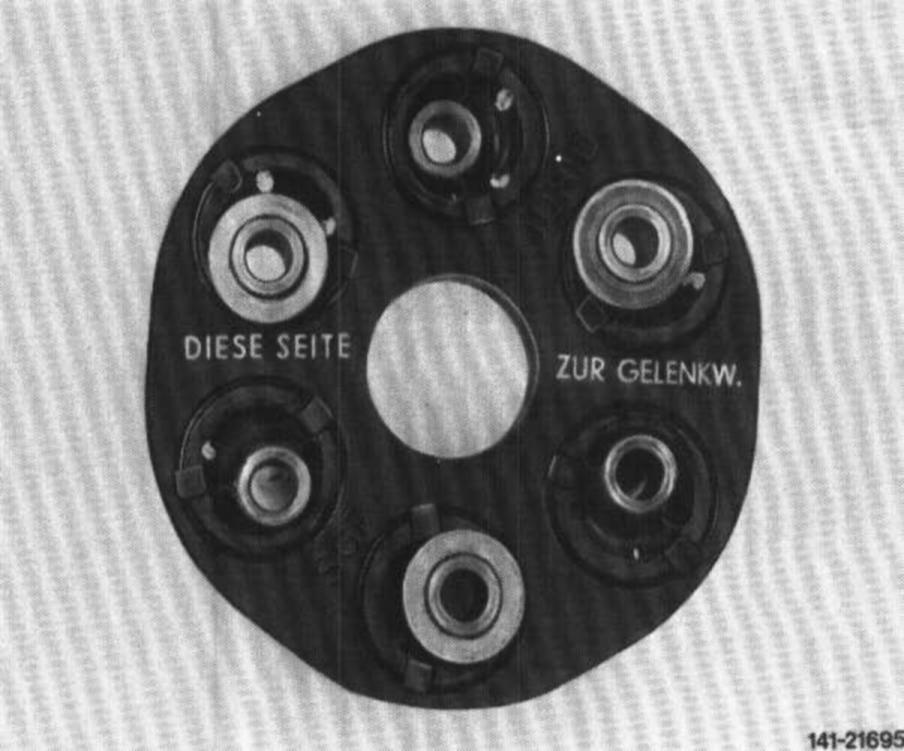 13 Mount tangentially soft companion plates (on vehicles with 5-speed transmission) in accordance with lettering "DIESE SEITE ZUR GELENKWELLE" ("This side toward propeller shaft")