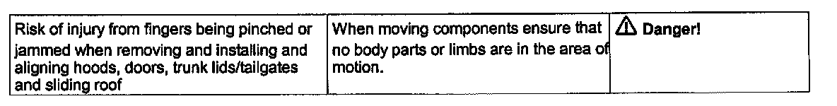 When working on hoods, doors, trunk lids, tailgates and sliding roofs as well as other body connecting mechanisms severe injuries can result from pinching, jamming or crushing of body parts such as fingers and hands.